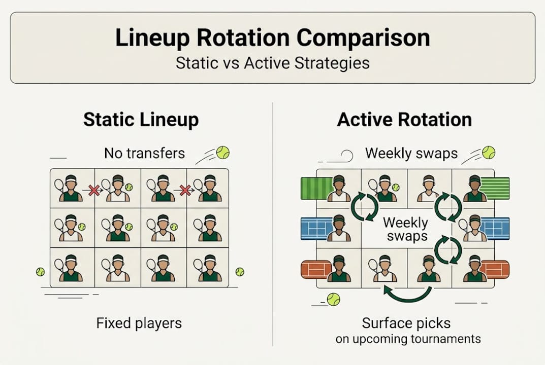 At its core, lineup rotation means regularly swapping players in and out of your active roster to match the week's tournaments and squeeze out the most fantasy points possible. It's not panic trading. It's a planned, deliberate process that responds to the tennis calendar, player form, surface changes, and draw difficulty.
