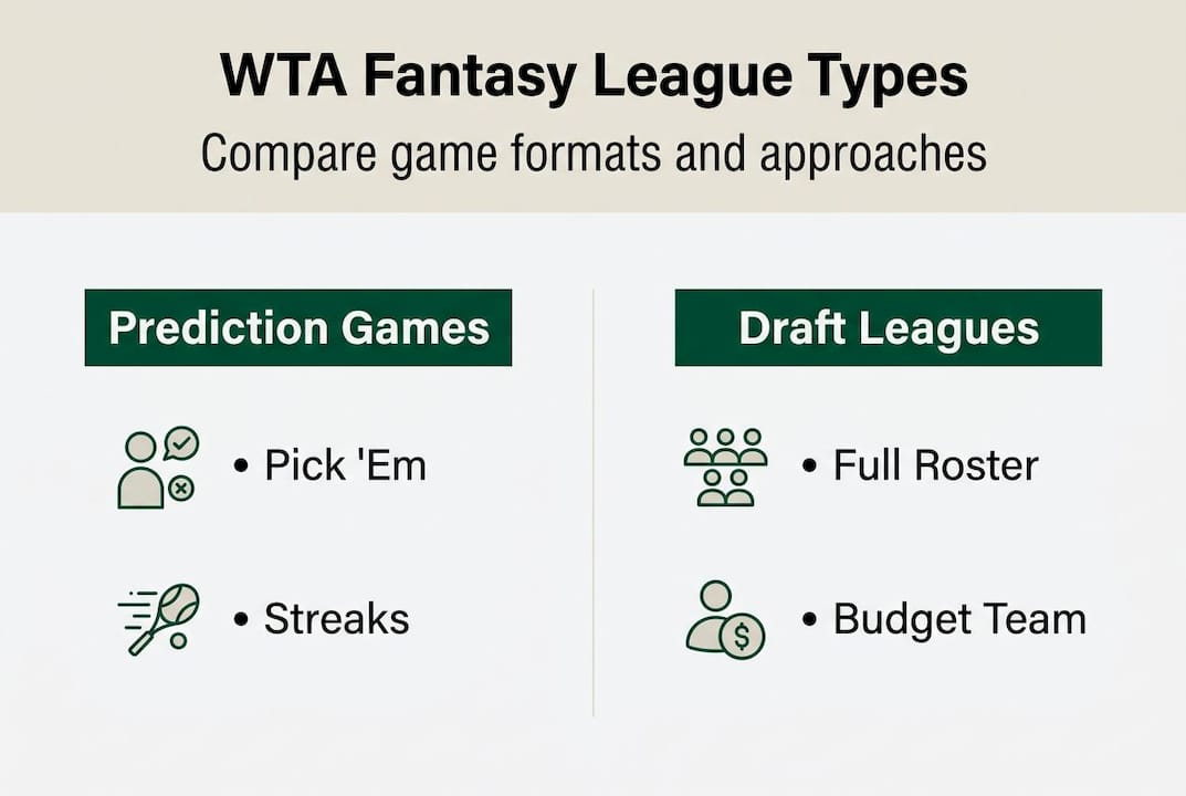 There is no official draft-based WTA fantasy league, but the WTA offers free-to-play Pick 'Em and Streaks prediction games through WTA Unlocked. These are beginner-friendly and tied to the live tour calendar.